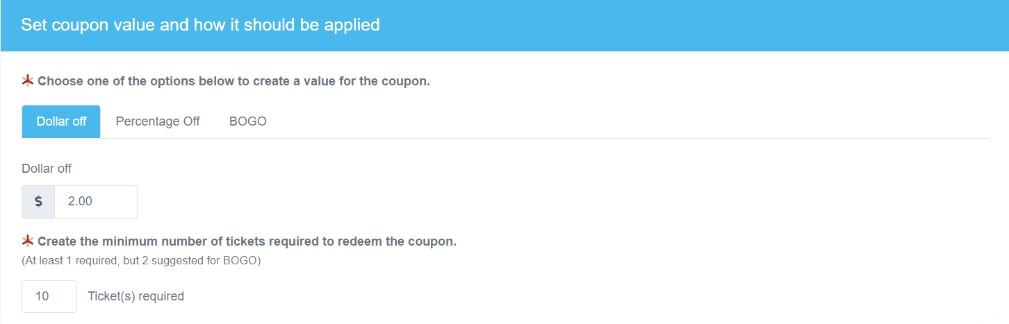 Choose from dollar or percentage discounts, or create buy-one-get-one (BOGO) offers