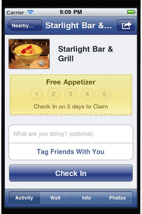 We’ve written about location based services (LBS) in the past, and now Facebook has actively jumped into the business of “check-ins”, giving LBS start-ups like FourSquare and Gowalla cause for concern. When you create your Page as a “Local Business or Place”, your physical address is required and visible as Basic Information about your venue. This data is used not only to let your fans know where your venue is located, but to allow them to check-in when they are in physical proximity to your venue. With a smart phone and the Facebook app (or web browser), fans will see your venue in the “Places” tab, and they’ll be able to tag themselves and friends for a real time shout to others that they are at your venue. They can add comments, pictures, and information all through a single Check-in. Facebook counts each check-in towards fan rewards when venues offer “Deals”.