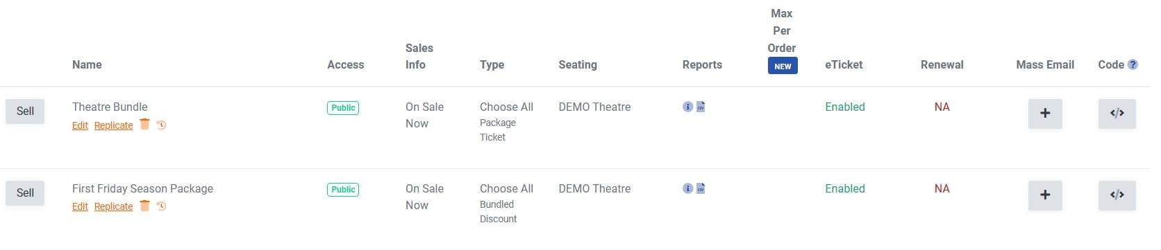 From here you can see if each of your packages are public or private, fixed, choose all, or build you own, quick access to your sales report and orders, what type of seating the package offers, and the embed code button. Here you can also see the maximum number of packages that can be sold, draft renewal emails, see if your eTicket is enabled, and send a mass email to all your package holders. Read more about mass email here.