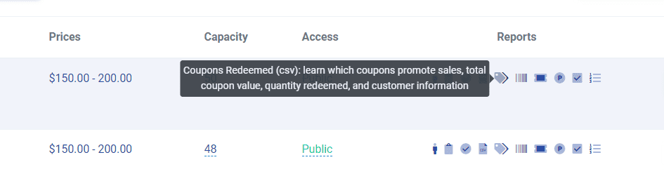 Once you’re on a specific event’s page, you can access reports for each performance in the reports column located to the right of the page.