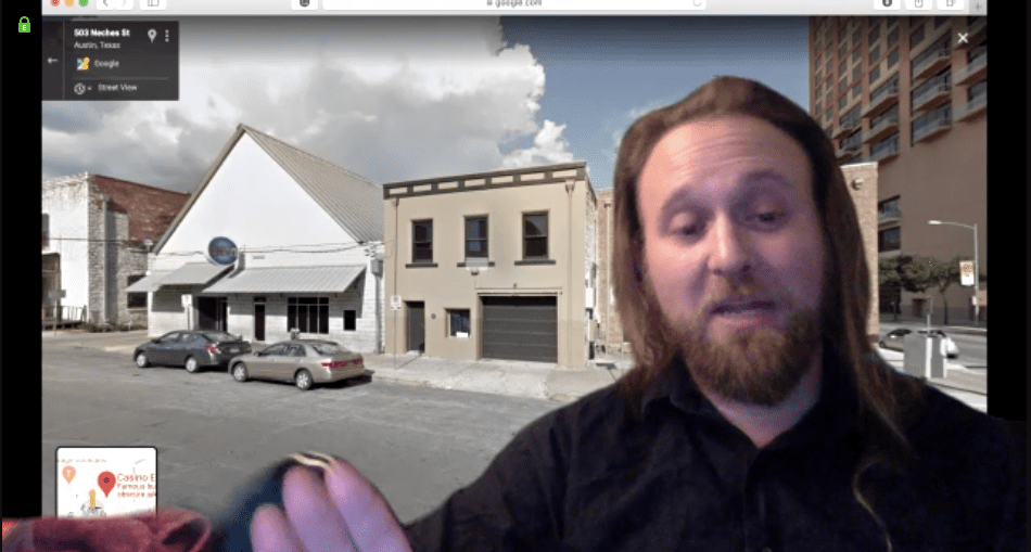 As a more tech-savvy team member, John was able to collect photos from news articles, Google Images, Yelp, and Zillow for both images throughout downtown’s 6th Street and even within the buildings. He used these as the backdrop for his tours as we wound our way virtually through the streets of Austin.